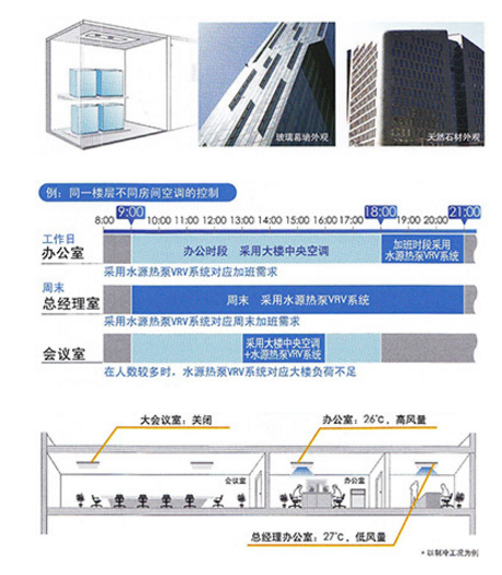 與傳統水系統中央空調配合,辦公時段采用大樓中央空調,加班時段則可靈活采用水源熱泵VRV系統對應空調需求。根據實際需 要,追加水源熱泵VRV系統。