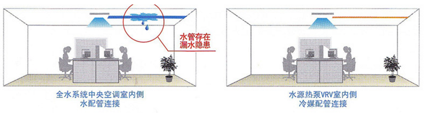大金水源熱泵VRV主機與室內機之間通過冷媒配管連接,水管集中布置于主機機房及管井內,大大降低了系統漏水對于室內重 要設備破壞的隱患。