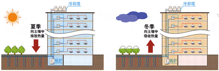 水源熱泵系列大金VRV空調,可靈活的將冷卻塔、鍋爐等傳統冷熱源作為輔助冷/熱源,通過科學合理的系統方案設計,有效保障土壤平衡。