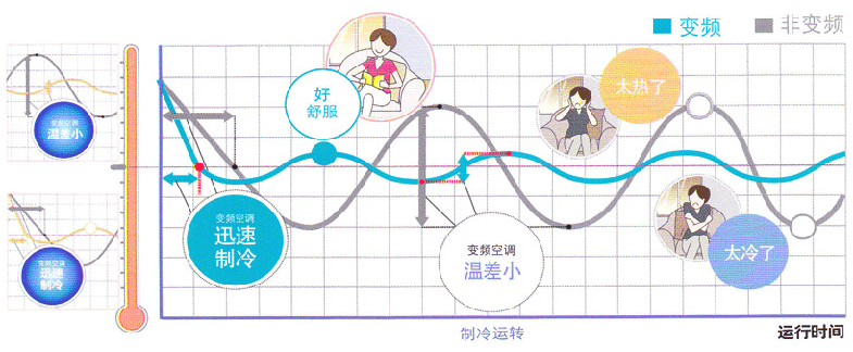 變頻空調能快速實現制冷制熱,在啟動初期,能以最大制熱(冷)量進行強力運轉,迅速達到設定溫度。空調在達到設定溫度后,壓縮機能根據室內負荷調整輸出功率,使室內溫度始終處于相對穩定狀態,減小溫度變化,避免忽冷忽熱。 而非變頻空調是當室溫到達設定溫度后,壓縮機停止工作,室溫上升。升至一定溫度后,再次啟動。引起室溫波動,人體感到不舒服。